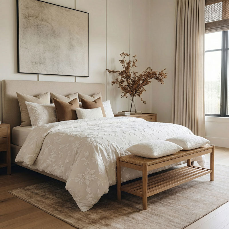 Edredón decorativo en tono beige, con un diseño floral discreto y elegante.